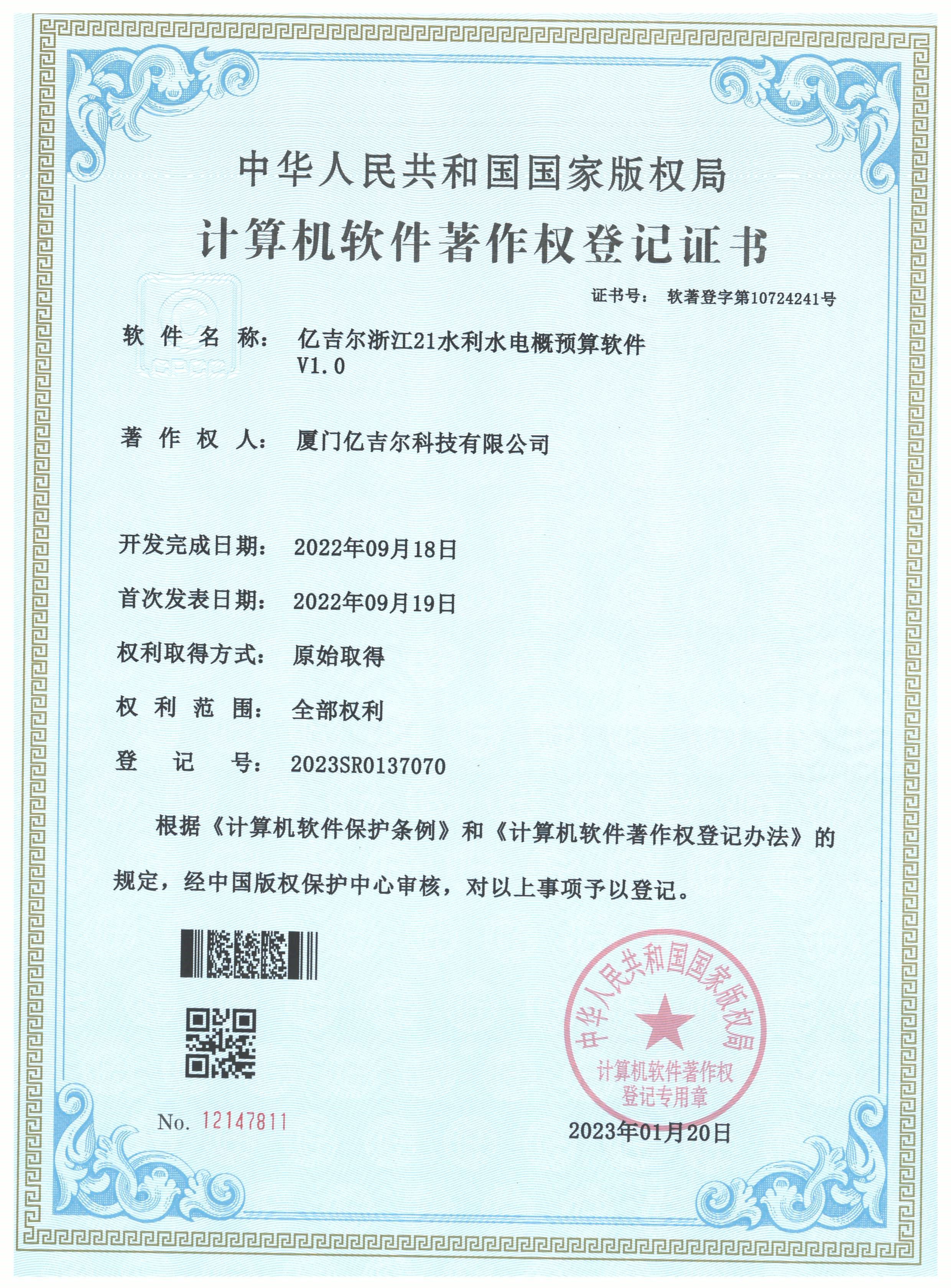 億吉爾浙江21水利水電概算軟件登記證書 發(fā)布日期:2023年11月22日 瀏覽次數(shù):3060 關(guān)鍵字: 公司 1/1億吉爾浙江21水利水電概算軟件登記證書(2022R11L1869444)