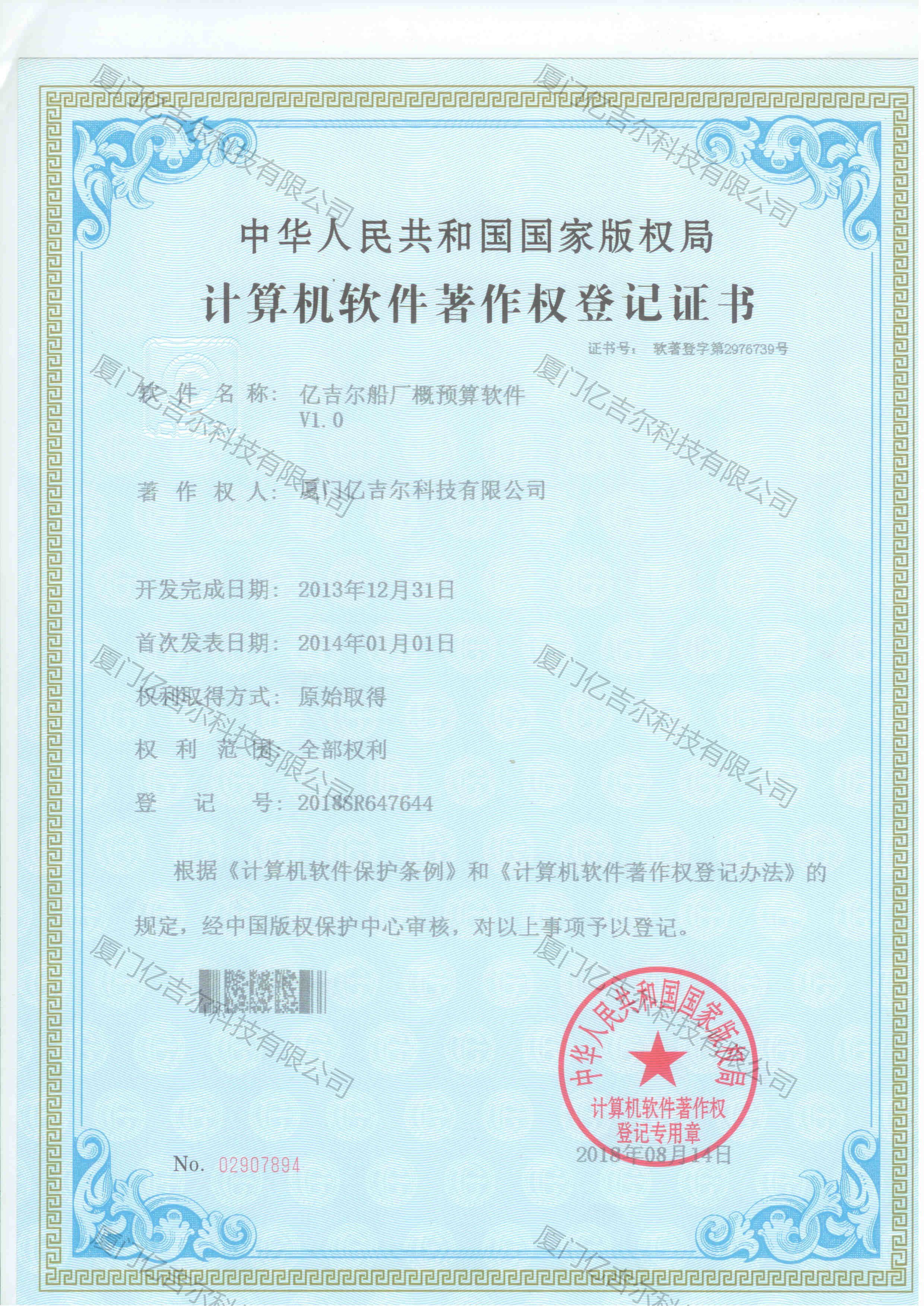 億吉爾船廠概預(yù)算軟件著作權(quán)登記證書 發(fā)布日期:2018年08月14日 瀏覽次數(shù):4546 關(guān)鍵字: 公司 1/1億吉爾船廠概預(yù)算軟件著作權(quán)登記證書