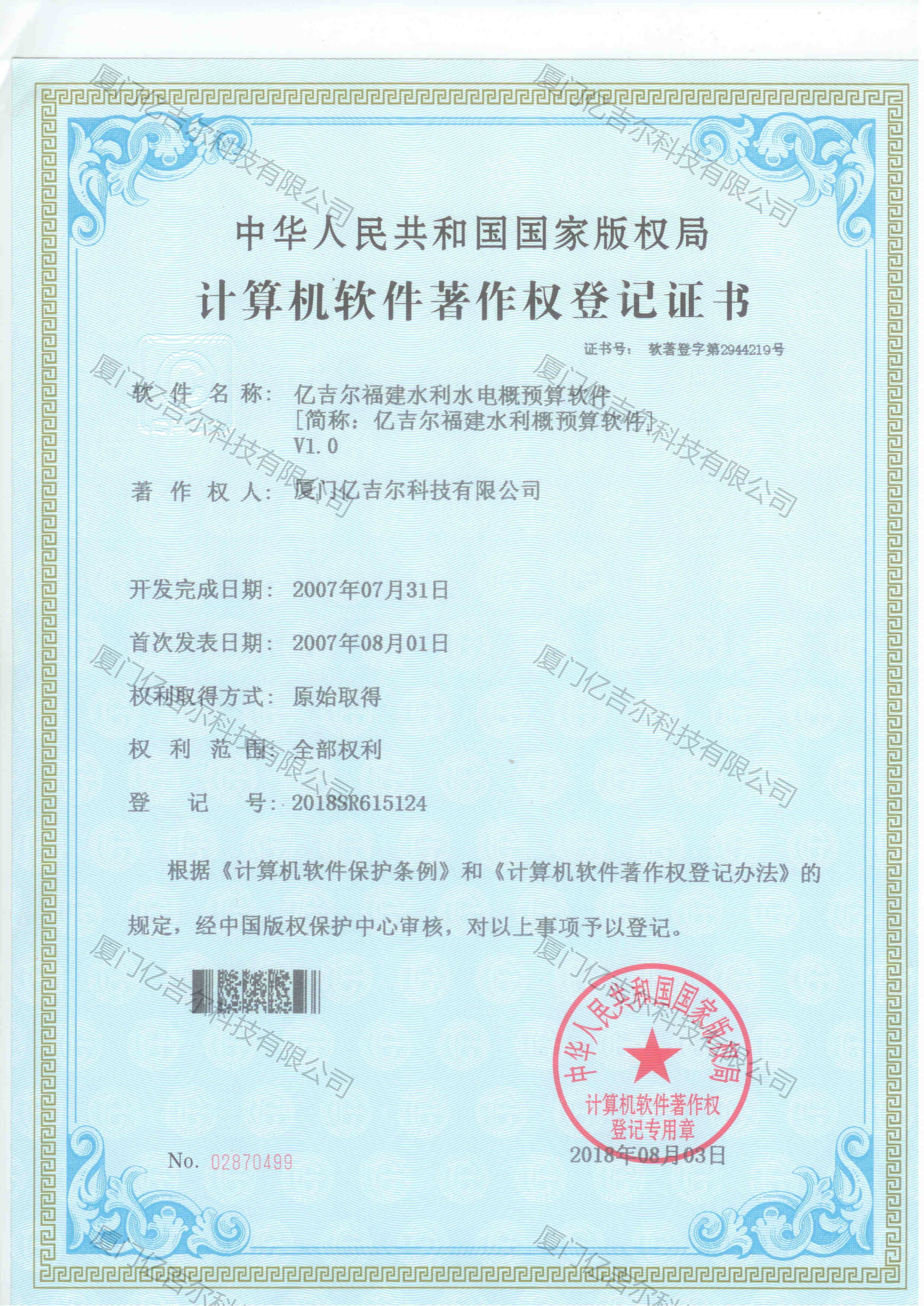 億吉爾福建水利水電概預(yù)算軟件著作權(quán)登記證書 發(fā)布日期:2018年08月03日 瀏覽次數(shù):4329 關(guān)鍵字: 公司 1/1億吉爾福建水利水電概預(yù)算軟件著作權(quán)登記證書