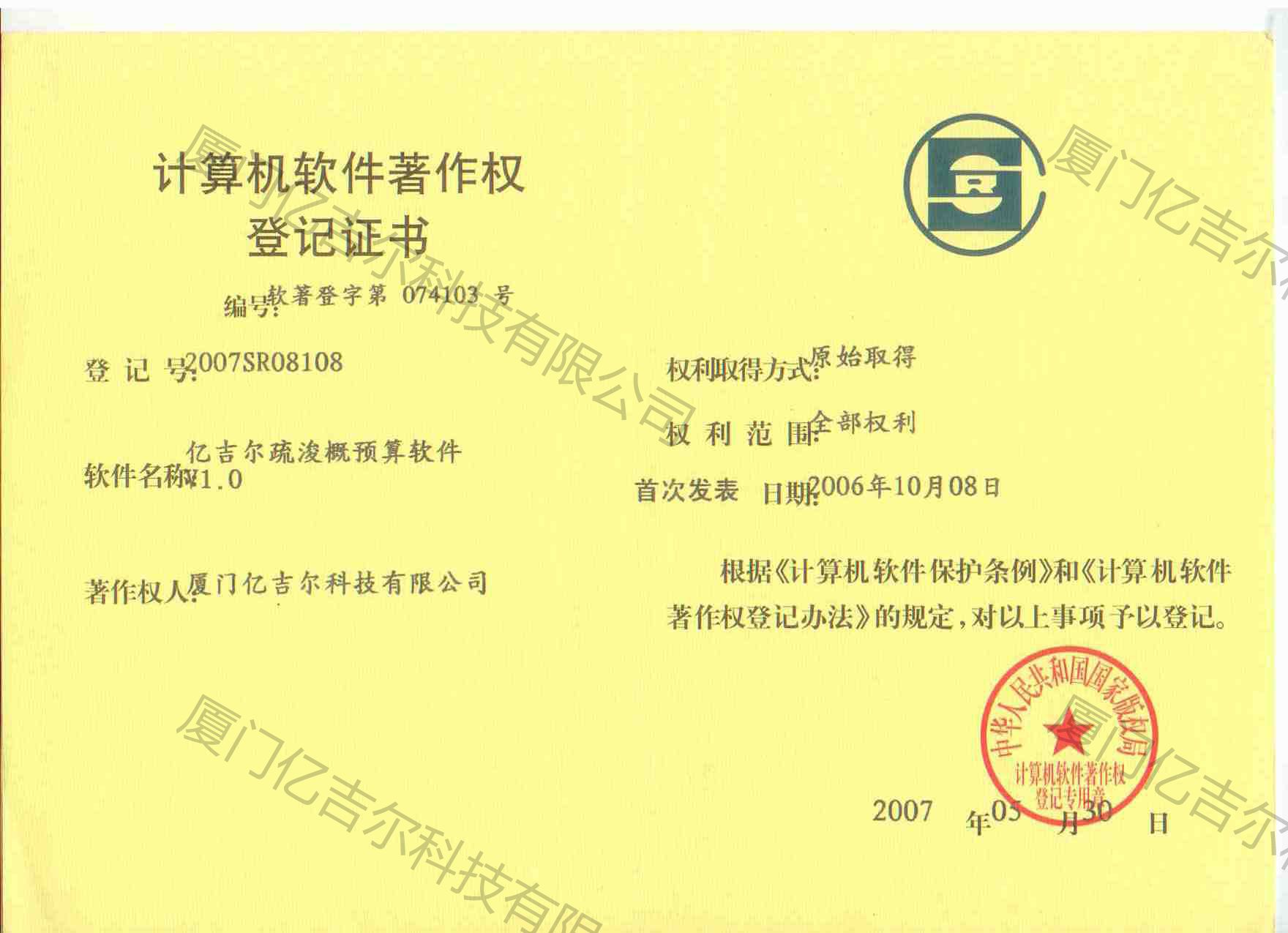 億吉爾疏浚概預(yù)算軟件著作權(quán)登記證書(shū) 發(fā)布日期:2007年05月30日 瀏覽次數(shù):4290 關(guān)鍵字: 公司 1/1億吉爾疏浚概預(yù)算軟件著作權(quán)登記證書(shū)