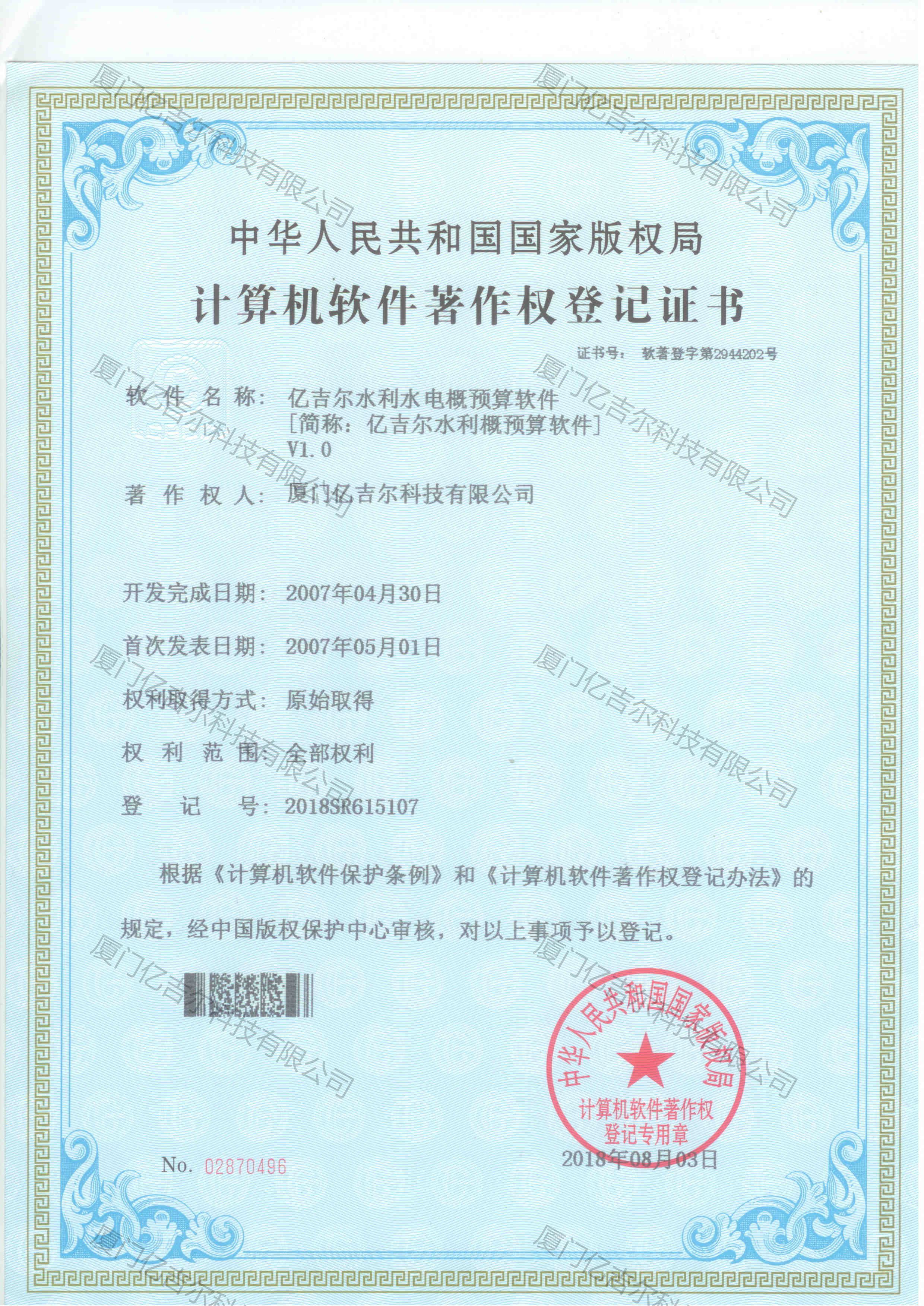 億吉爾水利水電概預(yù)算軟件著作權(quán)登記證書 發(fā)布日期:2018年08月03日 瀏覽次數(shù):4307 關(guān)鍵字: 公司 1/1億吉爾水利水電概預(yù)算軟件著作權(quán)登記證書