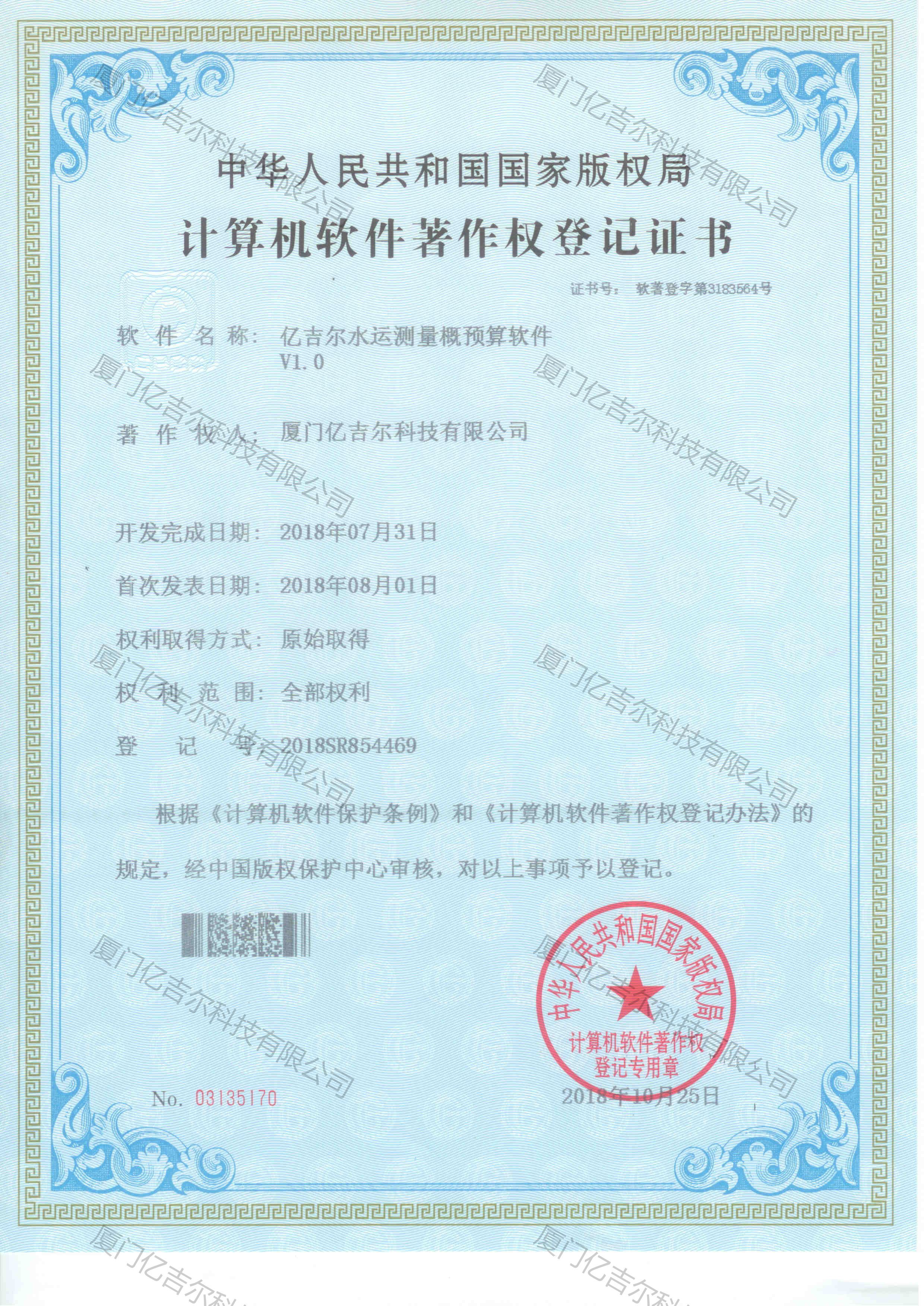 億吉爾水運(yùn)測量概預(yù)算軟件著作權(quán)登記證書 發(fā)布日期:2018年10月25日 瀏覽次數(shù):4620 關(guān)鍵字: 公司 1/1億吉爾水運(yùn)測量概預(yù)算軟件著作權(quán)登記證書